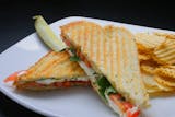 Turkey panini with bacon, lettuce, tomato, avocado & mayonnaise.